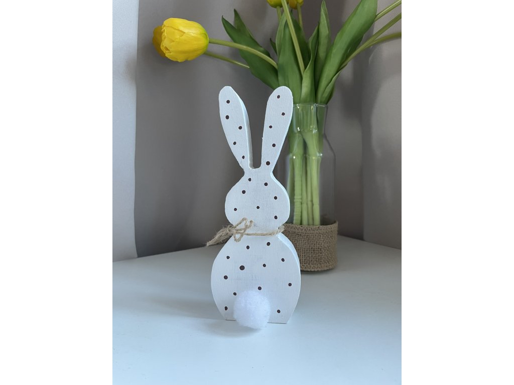 Velikonoční zajíček s puntíky a bambulkou, vyrobený z přírodní borovice, těší nejen svou jedinečností, ale i příjemnou vůní dřeva, která naplní váš prostor. Tento roztomilý zajíček je pokryt drobnými roztomilými puntíky.
